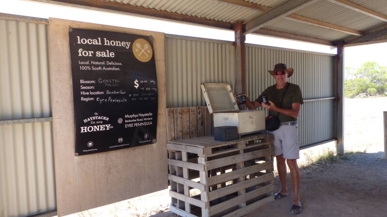 Diection Venus Bay, avec un arrêt aux rochers de Haystack, site géologique impressionnant. Nous achetons du miel à l'entrée du site. Il n'y a personne pour encaisser juste une petite boîte d'honnêteté. 10 dollars le pot de 500g, bio et fait dans la région. Pour visiter le site vous laissez 2 dollars dans la boîte d'honnêteté. A 13h nous faisons une halte déjeuner au pub de Port Kenny. Prix corrects pour une bonne salade et une bière, 24 euros. Avant d’arriver à Venus Bay, sur la route une petite cabane qui vend les légumes frais et bio avec une petite boîte d'honnêteté.
