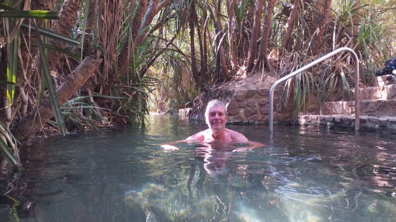 Les sources naturelles d'eau chaude à Katherine. 37 degré à l'ombre et eaux à 35 dégrés, presque rafraîchissantes. Baignade assurée sans crocodile à cette époque.