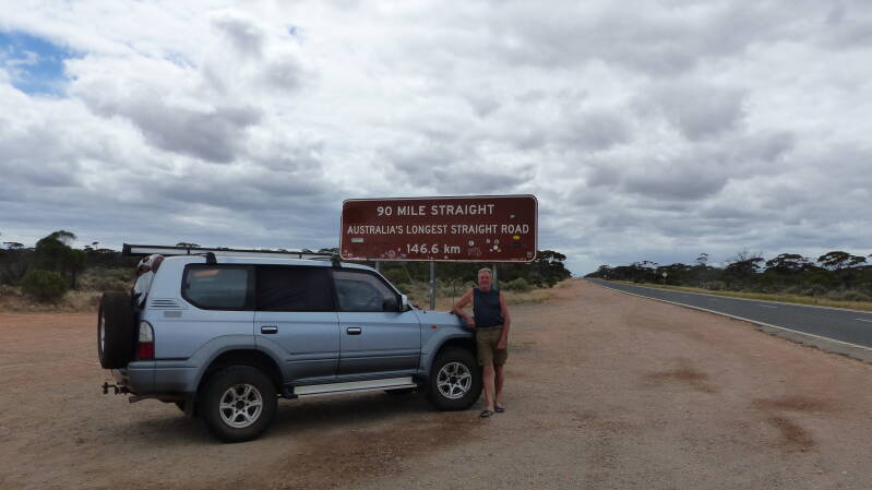 A 40km de Balladonia commence la 90 miles road, 146,6 km de route entièrement droite, la plus longue du monde. Nous roulons à 80-90, les road train nous doublent sans soucis sur cette ligne droite à 110kmh. Nous pic-niquons à mi chemin.