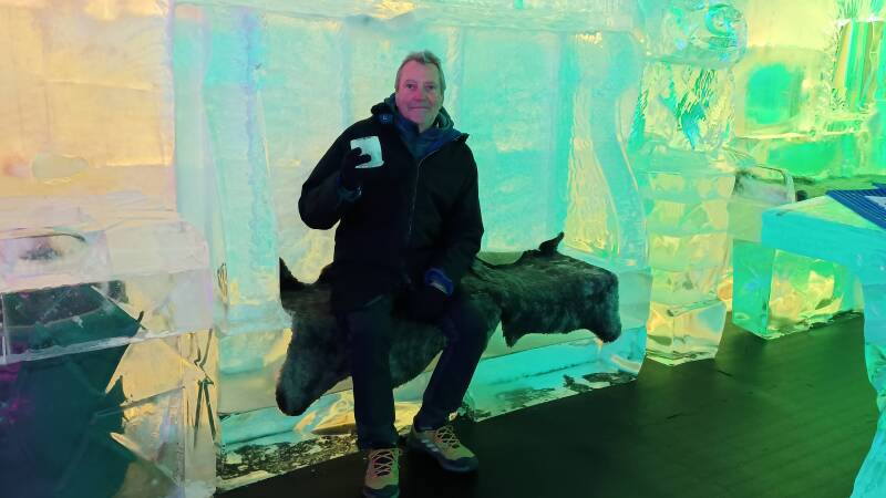 Le soir nous avons réservé deux entrées cocktail au ICE Bar, on nous équipe d'un bon manteau et de gants chauds, il fait moins 8 à l'intérieur, nous rencontrons une serveuses française très sympa, on prend notre cocktail à la vodka dans un verre en glace. Tout est en glace, le bar, les sièges, les étagères, la poubelle, on y reste 30mn, il commence à faire un peu froid. 34 dollars pour deux.